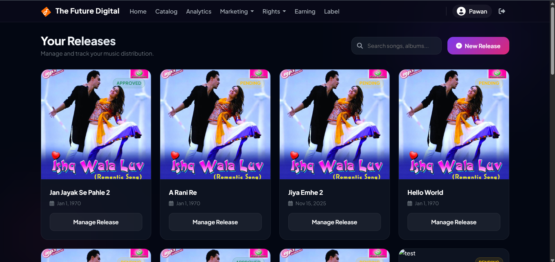 This project is a complete Music Distribution and Management Platform designed for music industries handling millions of members and their song releases. Artists can easily upload their tracks in .wav format, along with posters and all required metadata such as title, genre, lyrics, composer details, and more. The system ensures a seamless publishing process, giving creators full control over their releases. The platform integrates with major streaming services like YouTube, Spotify, Apple Music, and other global DSPs, allowing artists to track their real-time streams, earnings, and performance across all platforms. Every stream is recorded and reflected in the dashboard with accurate earning calculations. A powerful Admin Panel enables complete management of the system�from handling labels, artist accounts, and release approvals to monitoring streams, generating reports, managing payouts, and processing payment requests. Admins can send automated emails, approve or decline submissions, and control every aspect of platform operations. Features like allowlisting, user verification, payment history, and financial summaries make the system highly efficient and transparent. This project provides an all-in-one solution for music distribution, revenue tracking, and artist-label management, ensuring smooth operations for both creators and administrators.