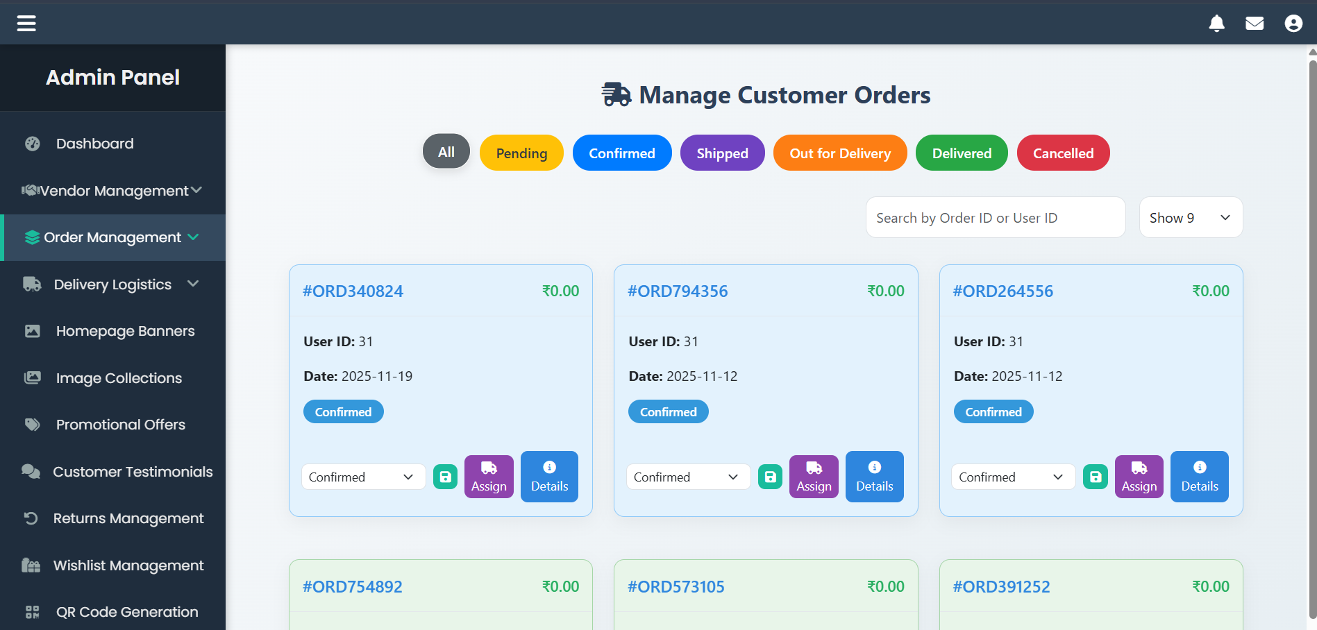The Royal Bakers Multi-Vendor E-commerce Platform is a fully responsive and feature-rich online marketplace designed to manage complex workflows for Admins, Vendors, Users, and Delivery Agents with complete efficiency. Developed for Systaio, this project delivers a seamless shopping experience and a powerful management system, built with high performance, security, and scalability in mind. This dynamic platform allows users to browse categories, explore products, add items to the cart, manage multiple addresses, and complete orders through COD or online payments. Vendors have their own dedicated panel to manage products, track orders, and update order status in real time. Admins are given full control over the system, including product management, vendor approval, user handling, order tracking, banners, offers, and category customization. Delivery agents can securely log in, view assigned orders, upload delivery proof, and update delivery status. With an intuitive interface, OTP verification, smooth product management, dynamic banners, responsive pages, and optimized workflows, this multi-vendor system ensures a complete end-to-end e-commerce solution for businesses looking to scale.